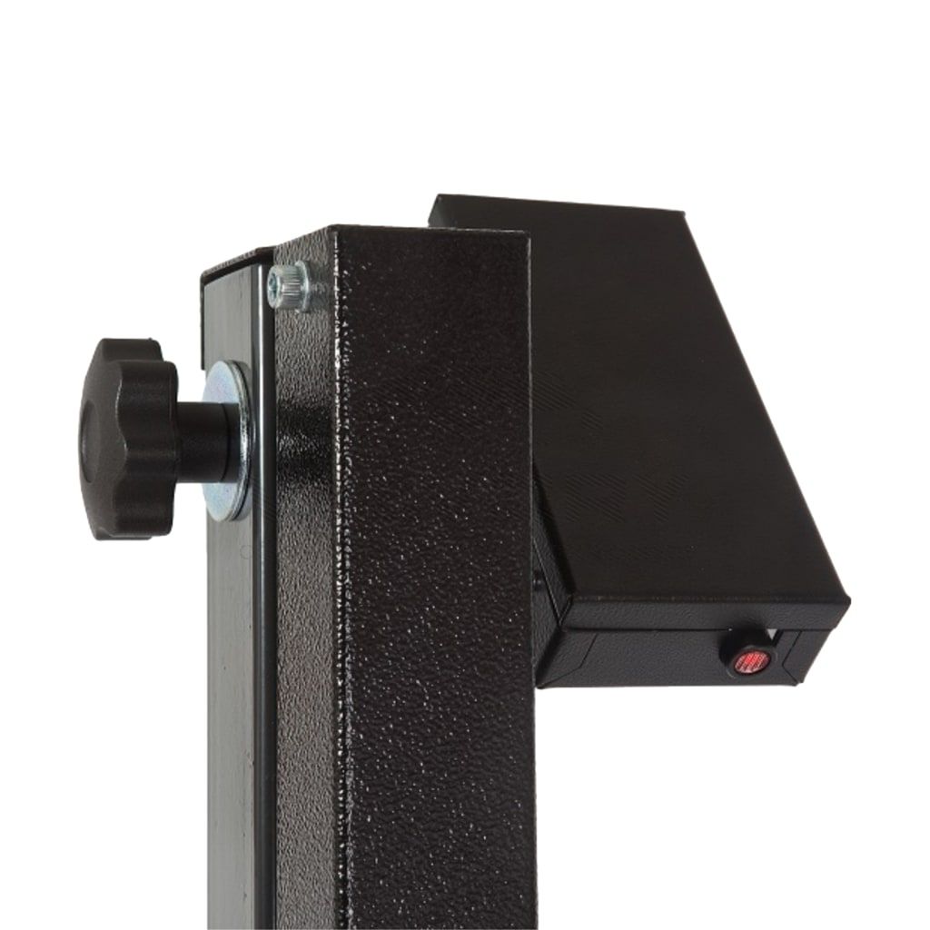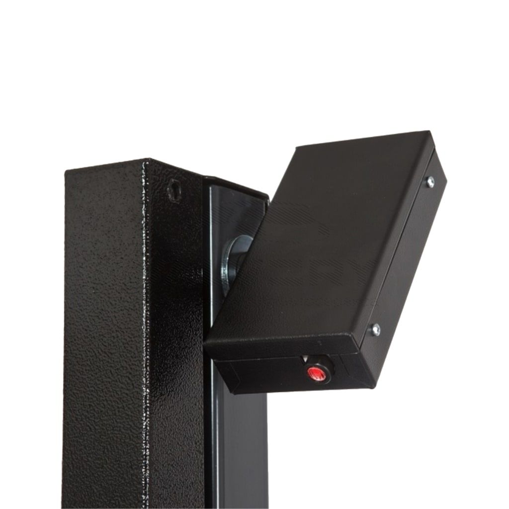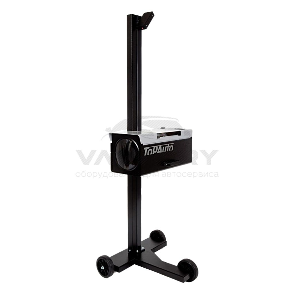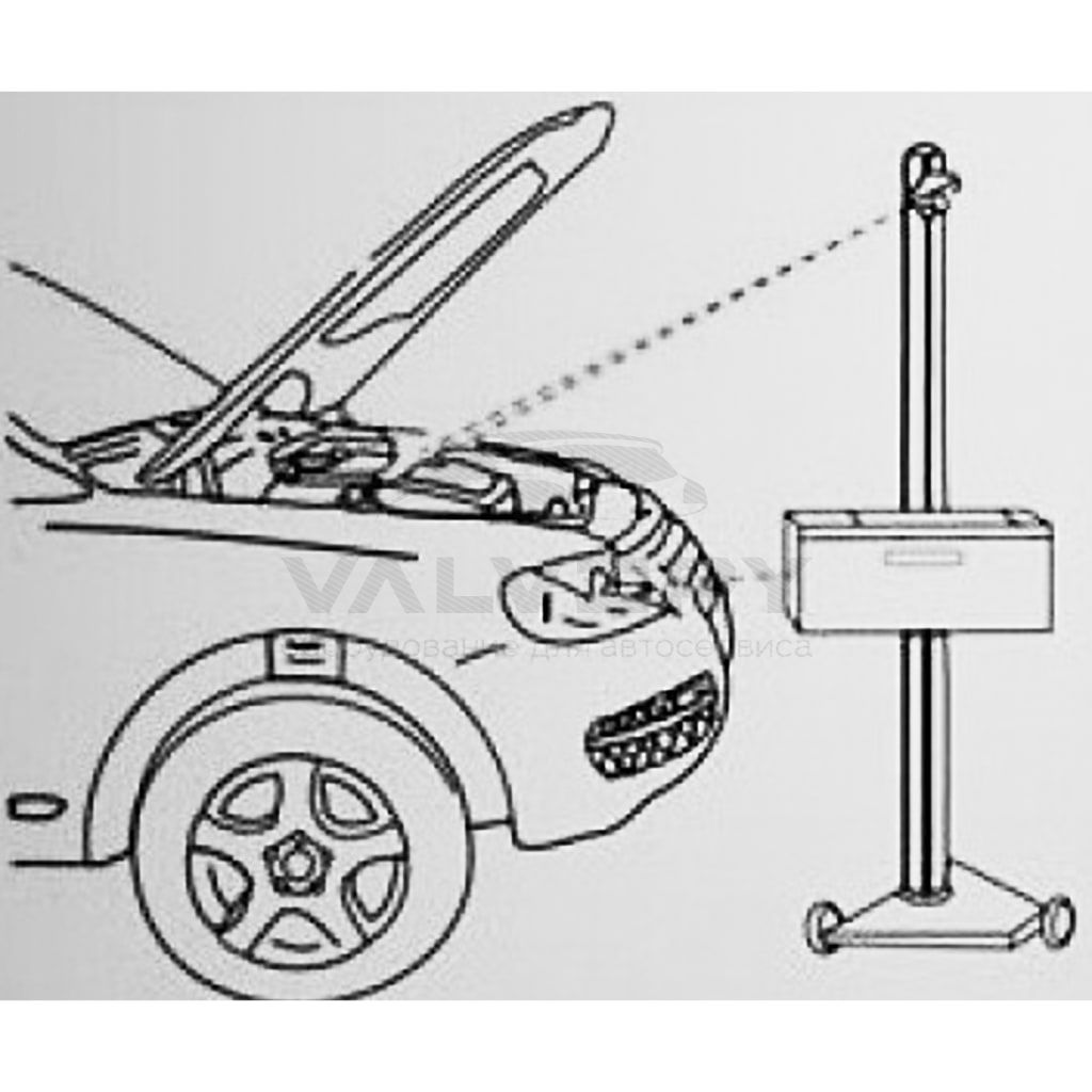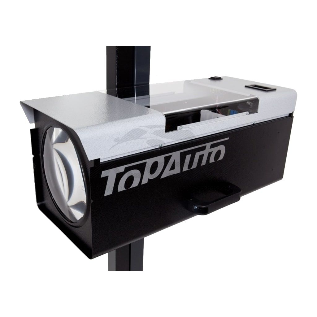 - Позиционирование прибора относительно транспорта осуществляется при помощи лазерного визира, зафиксированного в верхней части неподвижной стойки и лазерной системы центровки фары.